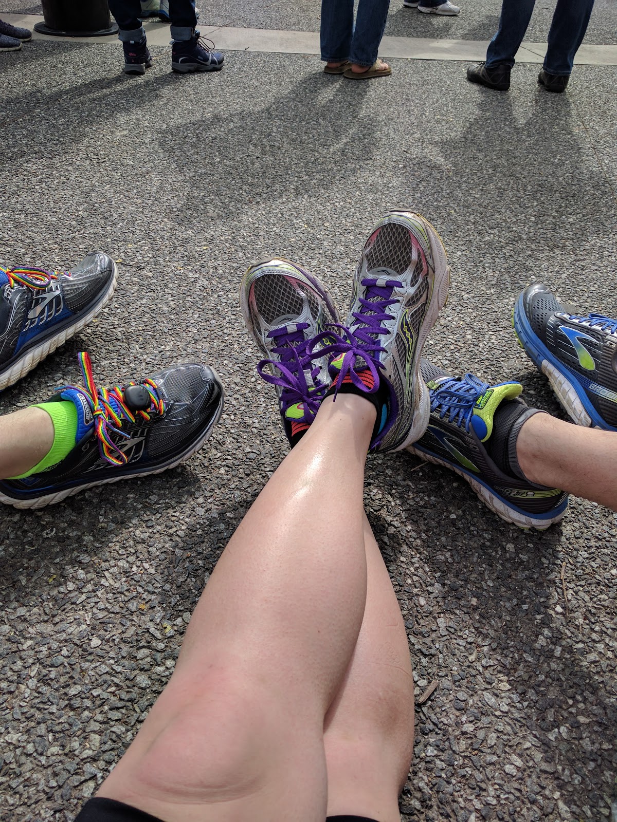 My knee has progressed relatively well, all things considered, and while I might feel it a little during a run (especially with stops and starts), it calms down almost immediately after and doesn't give me any pain the next day, which is really reassuring! Last week was the first time since I injured it that I was able to complete all my planned runs. I'm still trying to be considerate of it, though, and Saturday was one of the warmer days so far this year, so I had no plans for any kind of speedy finish or anything like that. I knew of at least one person who was running 12:30(ish) and only wanted to do ten miles like me, so as long as we could find each other, we wouldn't have to go it alone.